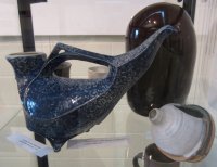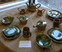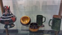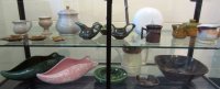 Certainly, the major contributor to this particular display, and understandingly so, is Céramique de Beauce (known as Beauceware in Ontario) with about one hundred individual pieces displayed. The most prolific child of a Government of Quebec initiative in 1939, it was designed to retain residents of the Beauce in that region year-round, particularly as the clay soils of that region were most suitable for pottery making. As well, the school that was set up to train potential potters was affiliated with the prestigious École du meuble de Montréal and the École des beaux-arts de Montréal, and it is considered that these were proponents of the Quebec version of the Arts and Crafts movement. Pierre-Aimé Normandeau, one of the founders of modern ceramics in Quebec was a major figure of the former and was instrumental in training and influencing numerous Quebec potters, for example, Jacques Garnier (see black satin ashtrays) and Raymond Lewis.